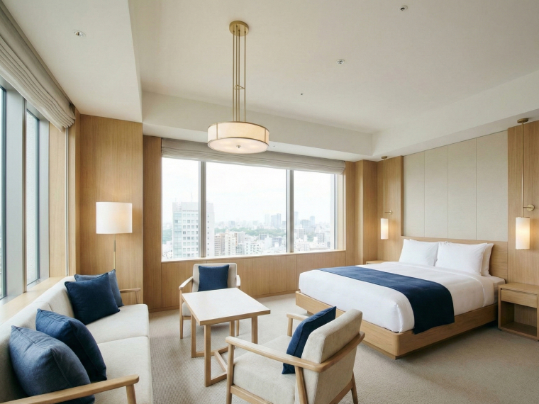 全室が現代的なモダンデザインとクラシックなエレガンスを融合した空間。高級感あふれる調度品や快適なベッドで、心からリラックスできる特別なひとときをお過ごしいただけます。窓の外に広がる美しい景観が、日常から離れた贅沢を演出します。