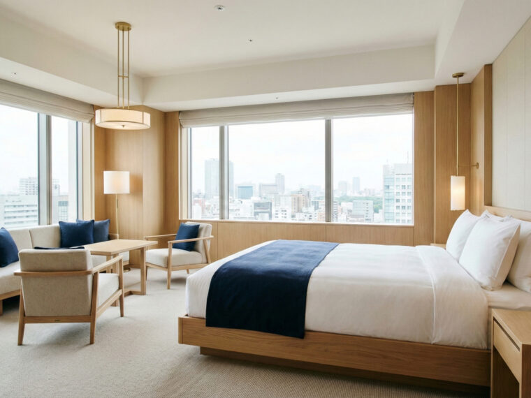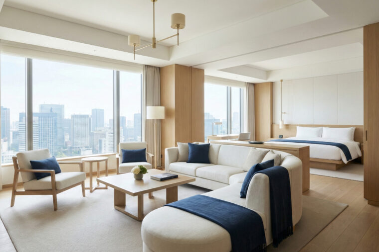 全室が現代的なモダンデザインとクラシックなエレガンスを融合した空間。高級感あふれる調度品や快適なベッドで、心からリラックスできる特別なひとときをお過ごしいただけます。窓の外に広がる美しい景観が、日常から離れた贅沢を演出します。